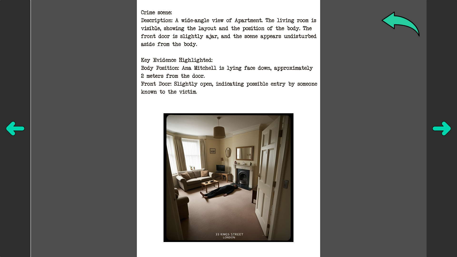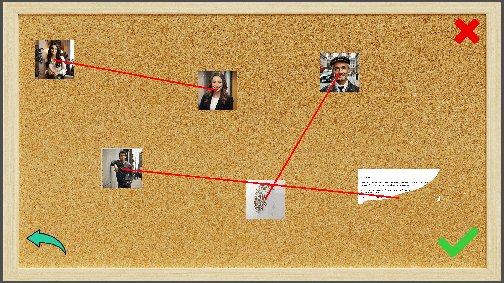 It's something simmilar to sherlock holmes style where you deduct solution. You connect all important evidances to each other on pin board and then culprit name and motive. After you submit it should change to you win scene, if nothing happens then you are wrong.